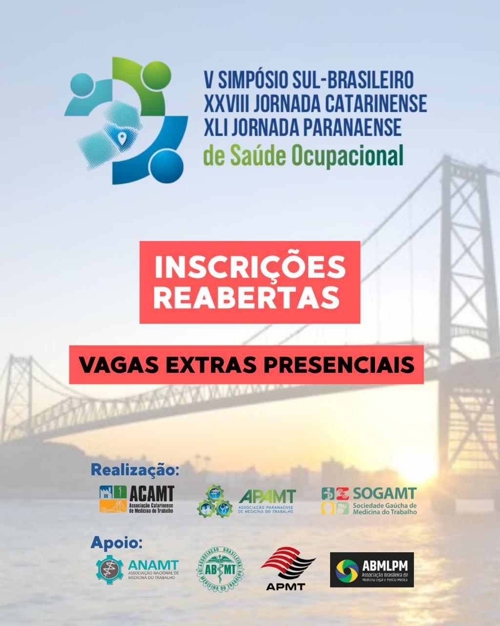Nos dias 13 e 14 de março de 2026, Florianópolis sediará o V Simpósio Sul-Brasileiro de Saúde Ocupacional, juntamente com a XXVIII Jornada Catarinense e a XLI Jornada Paranaense de Saúde Ocupacional.