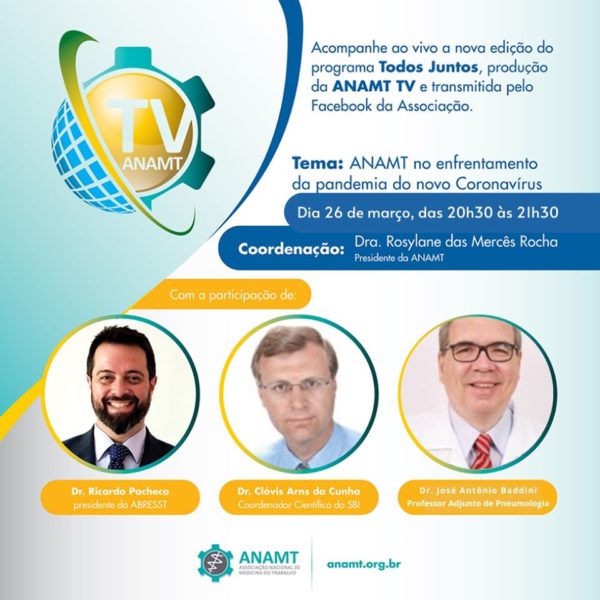 Nesta quinta, 26 de março, às 20h30, a ANAMT realizará uma nova edição do programa Todos Juntos, com transmissão ao vivo pela página no Facebook da entidade.