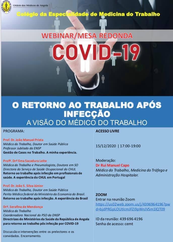 Hoje (15), às 13h (horário de Brasília), a Ordem dos Médicos de Angola, promove evento com participantes de Portugal, Brasil e Angola para discutir práticas no retorno ao trabalho após episódio de COVID-19.