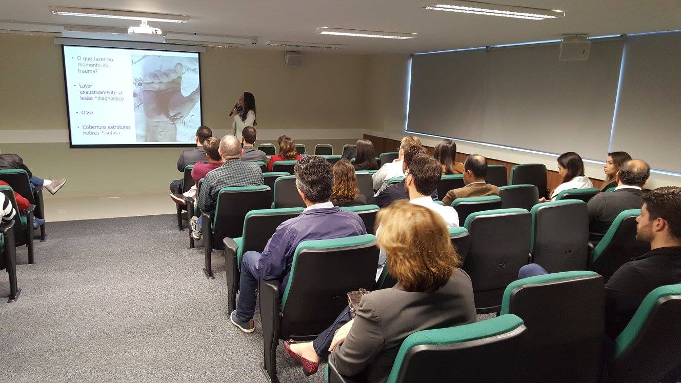 A segunda parte da aula focou na continuidade do atendimento pós trauma, com palestra da Dra. Giana Silveira Giostri, que orientou os presentes sobre a utilização de curativos, tempo de imobilização e indicação de órteses. Ela falou sobre as dificuldades de se restabelecer as funções das mãos após um trauma, dada a tendência de uma rigidez articular e a quantidade de articulações afetadas.
