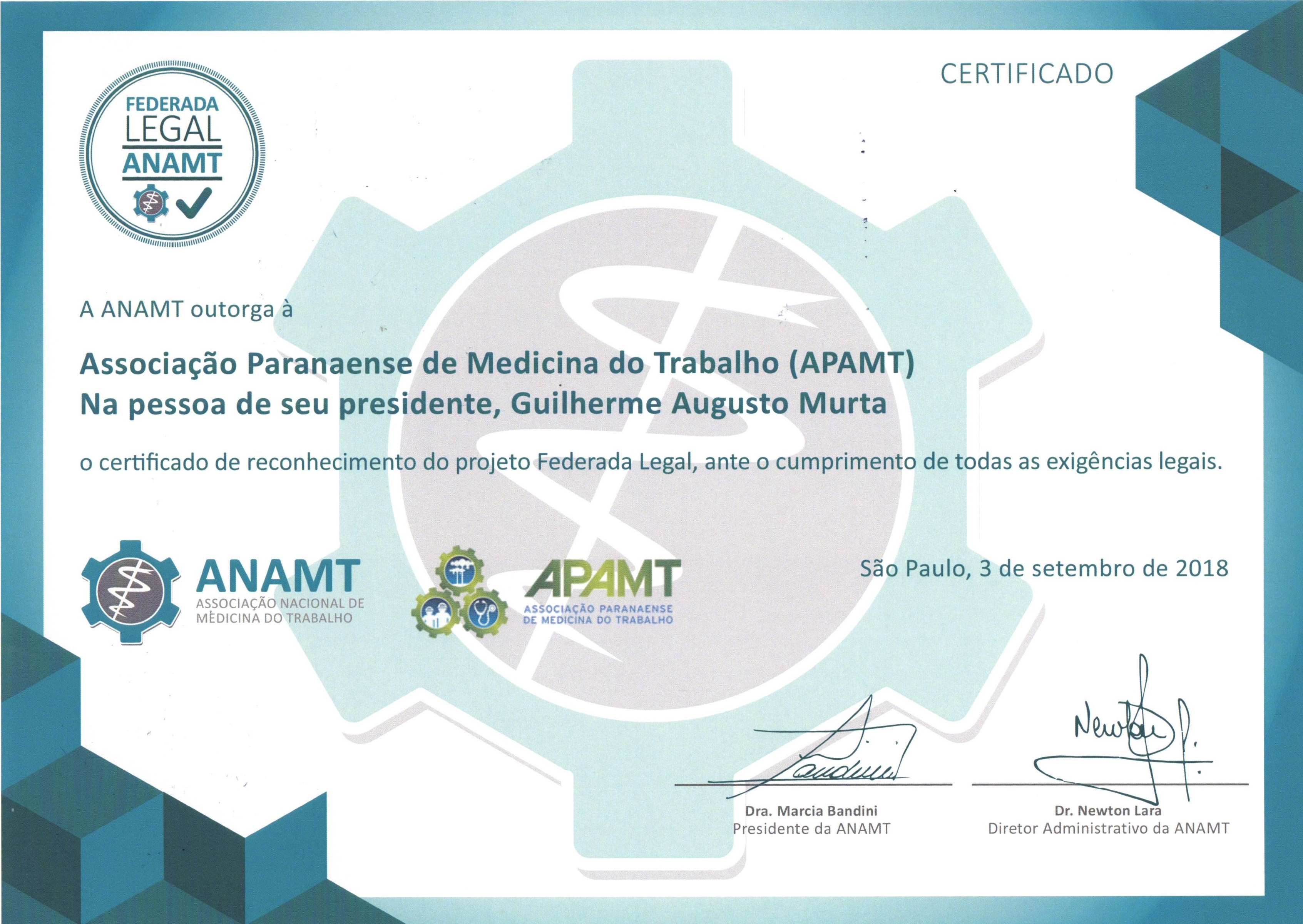 A Associação Paranaense de Medicina do Trabalho recebeu no início de setembro o certificado de reconhecimento do projeto Federada Legal, lançado em 2018 pela ANAMT e que tem o objetivo de apoiar as regionais a garantir sua regularidade documental com base em quatro pilares: institucional, administrativo, financeiro e jurídico.