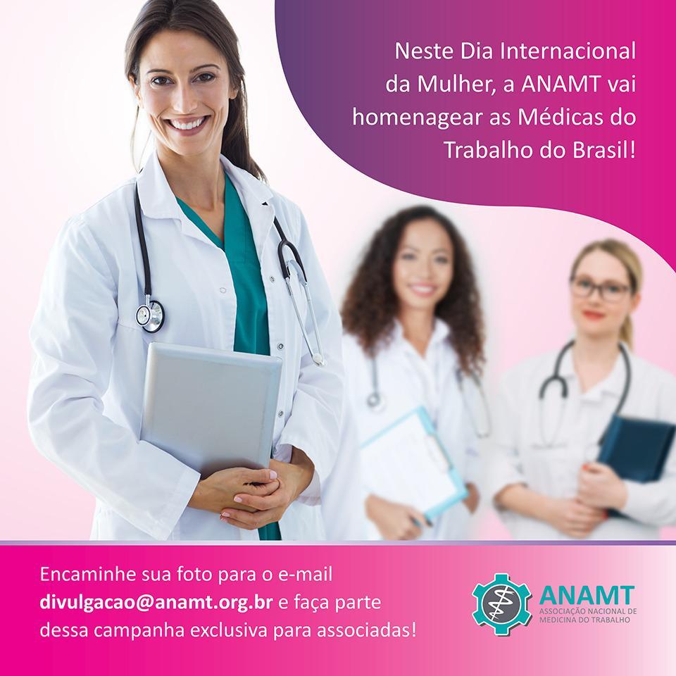 Para o Dia Internacional da Mulher, celebrado em 8 de março, a Associação Nacional de Medicina do Trabalho (ANAMT) vai homenagear as Médicas do Trabalho de todo o Brasil. Encaminhe sua foto para o e-mail divulgacao@anamt.org.br e faça parte dessa campanha exclusiva para associadas!