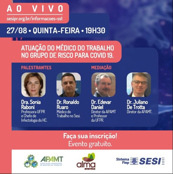 Para falar sobre o tema, esclarecer dúvidas e compartilhar experiências a APAMT e o Sesi Paraná promovem uma live nesta quinta-feira, 27/08, às 19h30. O evento online e gratuito terá a participação dos especialistas Dra. Sonia Mara Raboni, Professora da UFPR e Chefe de Infectologia do HC, e do Dr. Ronaldo Ruaro, Médico do Trabalho do Sesi PR, com moderação dos diretores administrativos da APAMT, Dr. Edevar Daniel e Dr. Juliano de Trotta.