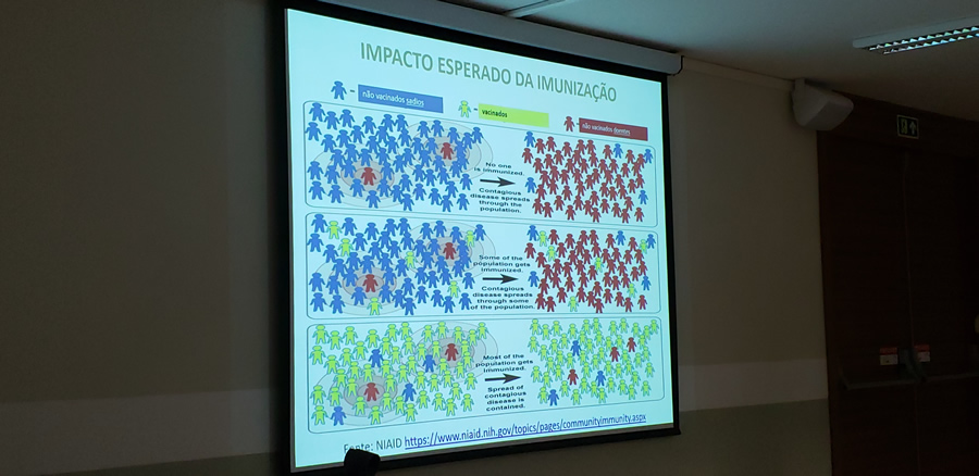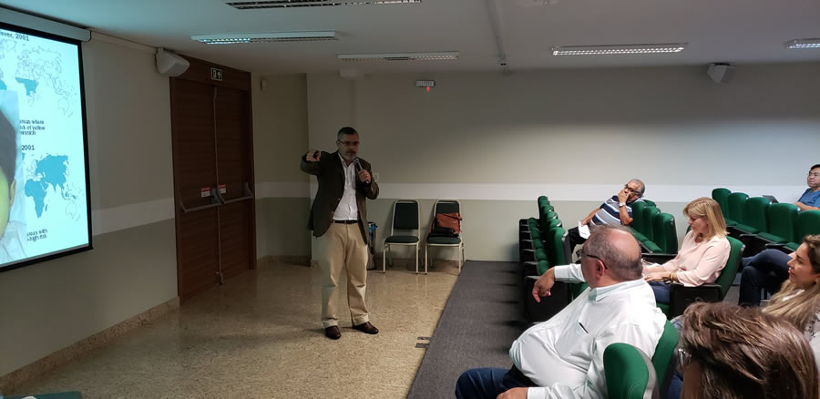 A palestrante iniciou apresentando um quadro comparativo entre as síndromes das arboviroses: febril, exantemática e hemorrágica, sendo que a febre amarela se enquadra nesta última, ao lado de doenças como meningite, malária, septicemia, entre outras. Na sequencia, falou sobre como se dá a transmissão pelo mosquito infectado, diferenciando a forma silvestre – transmitida pelo haemagogus ou sabethes - e a urbana – transmitida pelo aedes. Até o momento não há casos urbanos identificados no país; o último registro data de 1942 e ocorreu em Sena Madureira, no Acre.