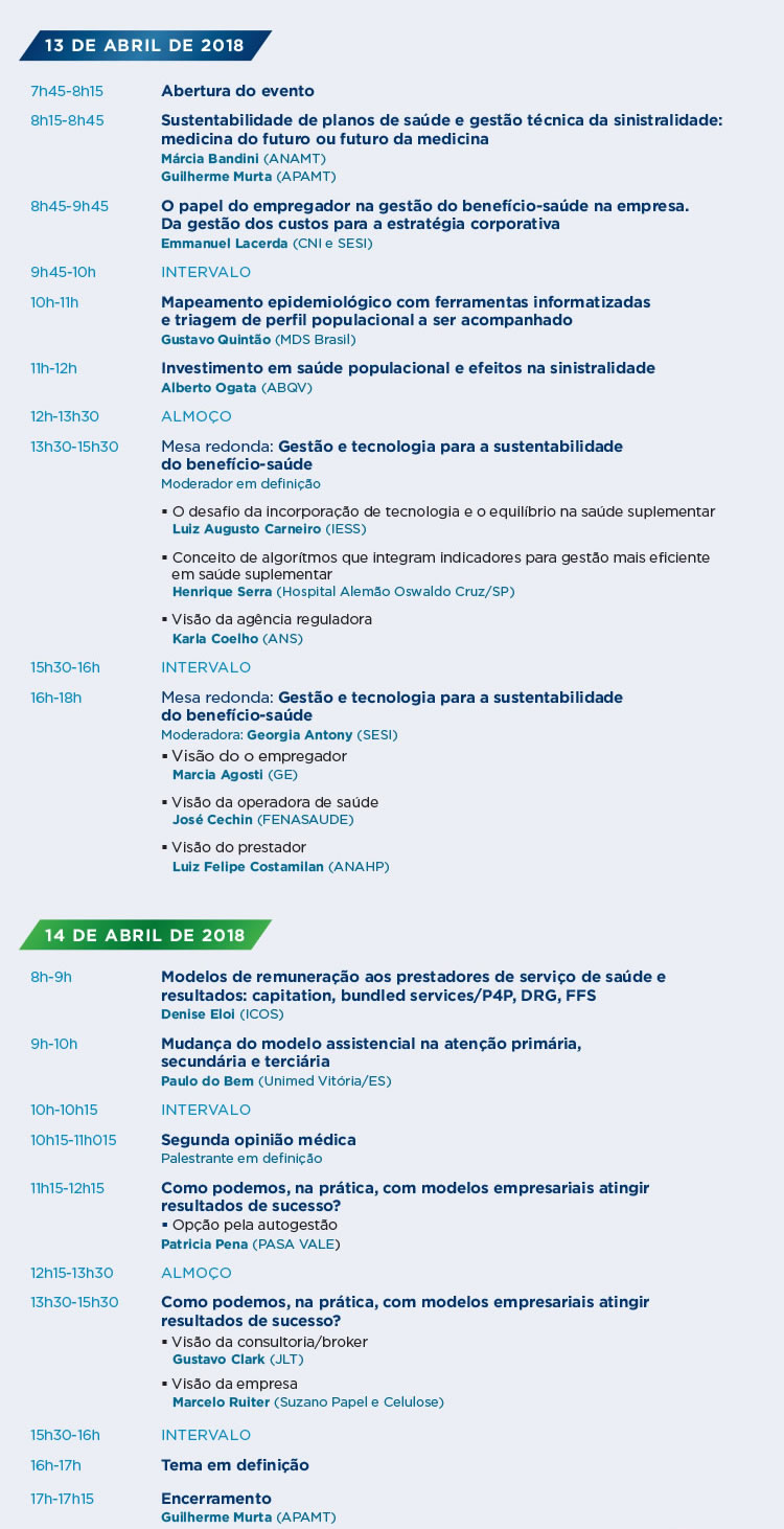 Entre os temas que serão abordados destacam-se a sustentabilidade dos planos de saúde, sua gestão e tecnologias; estratégias corporativas; perfil populacional e mapeamento epidemiológico; estratégias de investimento em qualidade de vida, saúde e bem-estar com custo-efetividade. Uso de ferramentas de BI; emprego de segunda opinião médica; modalidades de pagamento a prestadores de serviço e resultados(capitation, bundled serviços/P4P, DRG, FFS); machine learning algoritmos para gestão médica e administrativa e Medicina da Família como porta de entrada de casos eletivos em planos de saúde.