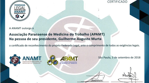 A Associação Paranaense de Medicina do Trabalho recebeu no início de setembro o certificado de reconhecimento do projeto Federada Legal, lançado em 2018 pela ANAMT e que tem o objetivo de apoiar as regionais a garantir sua regularidade documental com base em quatro pilares: institucional, administrativo, financeiro e jurídico.
